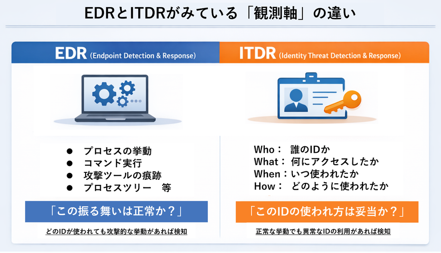 一方で、例えば攻撃者がなんらかのIDを用いてRDPでログインし、GUI中心で静かに操作を行った場合、エンドポイント上に「攻撃」と断定できる明確な痕跡が残らず、EDR単体では検知が難しくなるという構造的な限界があります。これは、EDRが「誰が・どこに・どの文脈でアクセスしているか」といったIDの利用文脈を主な判断軸としていないためです。しかし、IDの視点から見れば、こうした攻撃を検知・抑止できる余地が生まれます。